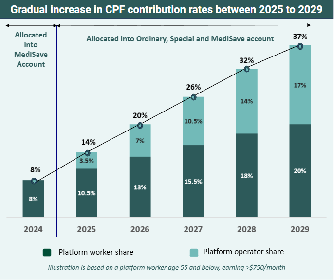 For platform workers born in 1995 or later, or who have opted in, the CPF contribution rate will gradually increase based on calendar year to align with employees by 2029.